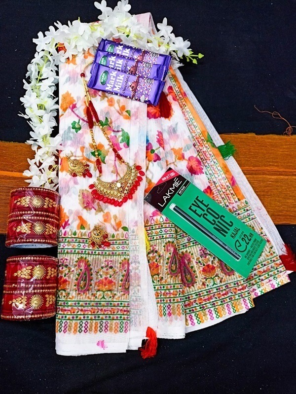 ★এই প্যাকেজে প্রথমেই পাবেন ১ টি কোয়ালিটি সম্পর্ণ শাড়ি, ★ সুন্দর একটি গলার সেট। ★ গলার সেট এর সাথে ১ জোড়া কানের দুল। ★ সাথে আরো পাবেন সুন্দর কারুকার্য করা ২ সেট হাতের চুরি । ★আরো সাথে থাকছে সুন্দর একটি মাথায় পড়ার গাজরা, যা আর্টিফিশিয়াল তাই কোরিয়ারে পাঠালেও নষ্ট হবে না । ★আরো পাবেন ৩ টা সুন্দর চকলেট । ★ এই সব জিনিস গুলো একত্রিত একটি সুন্দর আকর্ষণী গিফট বক্সে দেওয়া থাকবে ।