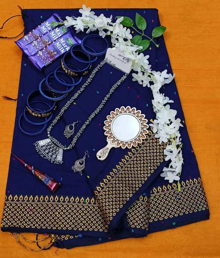★এই প্যাকেজে প্রথমেই পাবেন ১ টি কোয়ালিটি সম্পর্ণ শাড়ি, ★ সুন্দর একটি গলার সেট। ★ গলার সেট এর সাথে ১ জোড়া কানের দুল। ★ সাথে আরো পাবেন সুন্দর কারুকার্য করা হাতের চুরি । ★আরো সাথে থাকছে সুন্দর একটি মাথায় পড়ার গাজরা, যা আর্টিফিশিয়াল তাই কোরিয়ারে পাঠালেও নষ্ট হবে না । ★আরো পাবেন ৩ টা সুন্দর চকলেট । ★ ১ টি মেহেদী থাকবে ★ আরো পাবেন সুন্দর কারুকার্য করা একটি কাঠ ফ্রেম এর আয়না। ★ এই সব জিনিস গুলো একত্রিত একটি সুন্দর আকর্ষণী গিফট বক্সে দেওয়া থাকবে ।