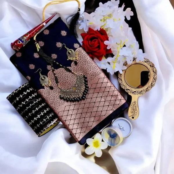 Best Gift for your Friends and Family half silk saree & Jewellery Combo Set. blue. jamdani