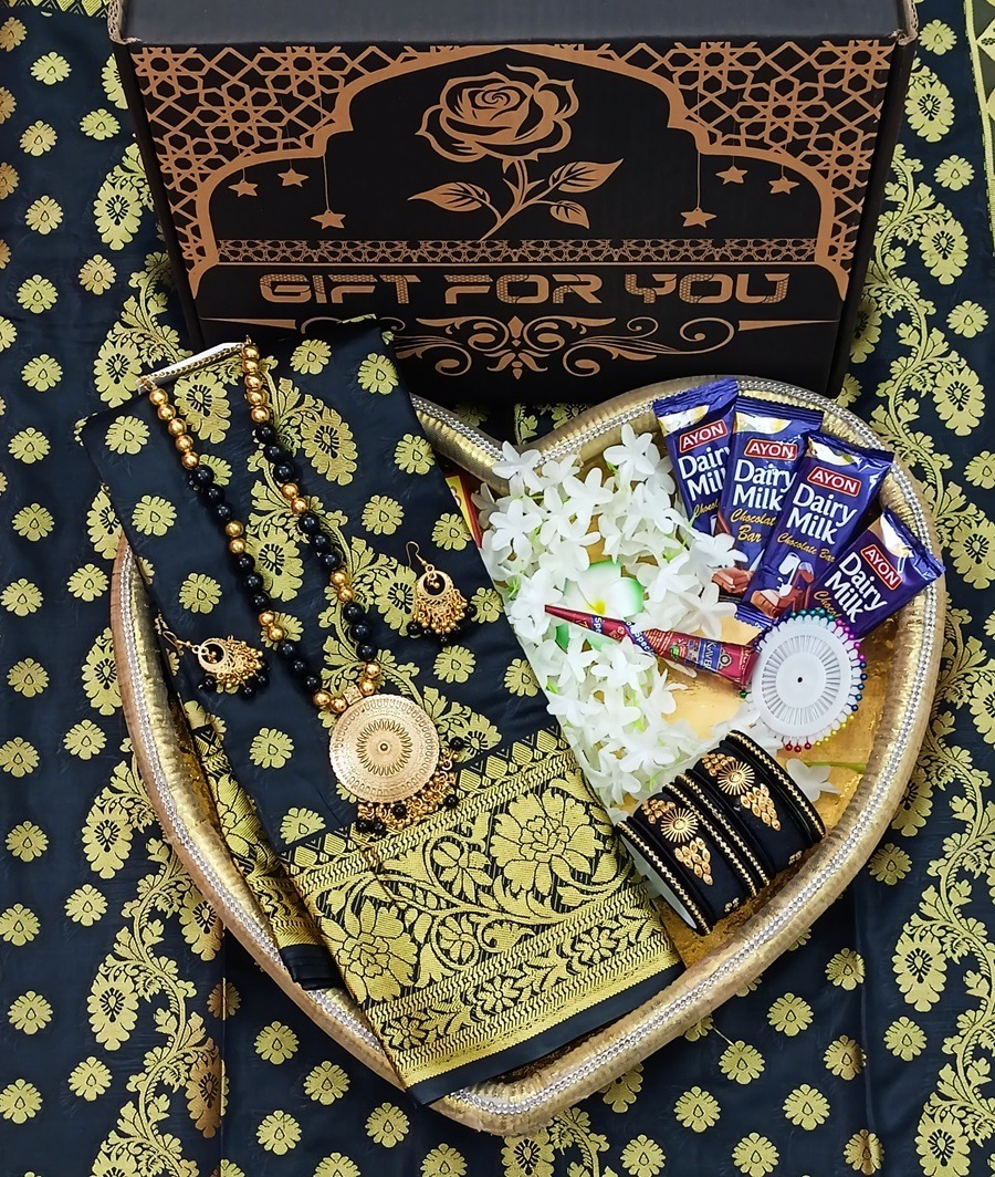 Best Gift for your Friends and Family half silk saree & Jewellery Combo Set. black drop